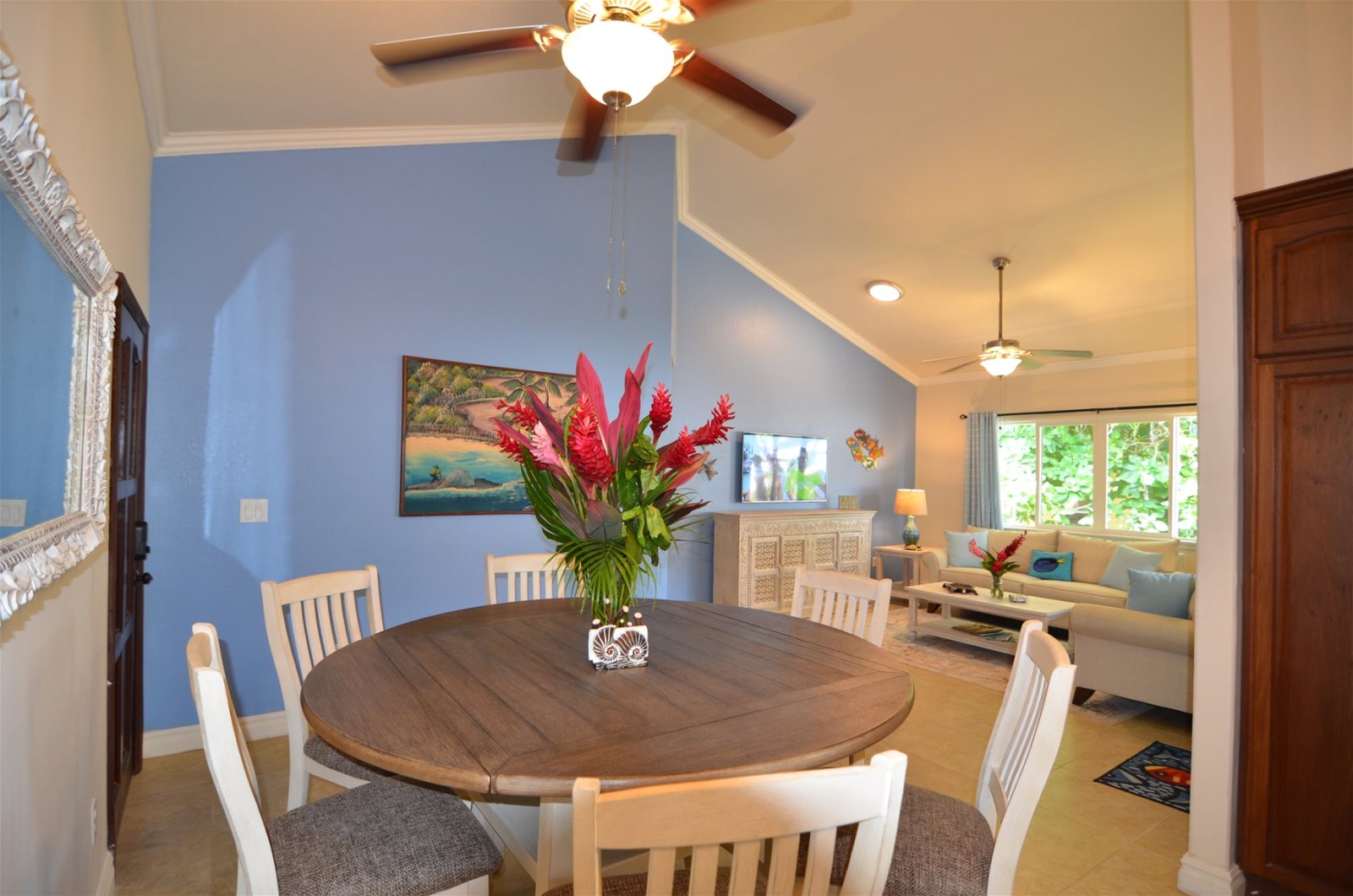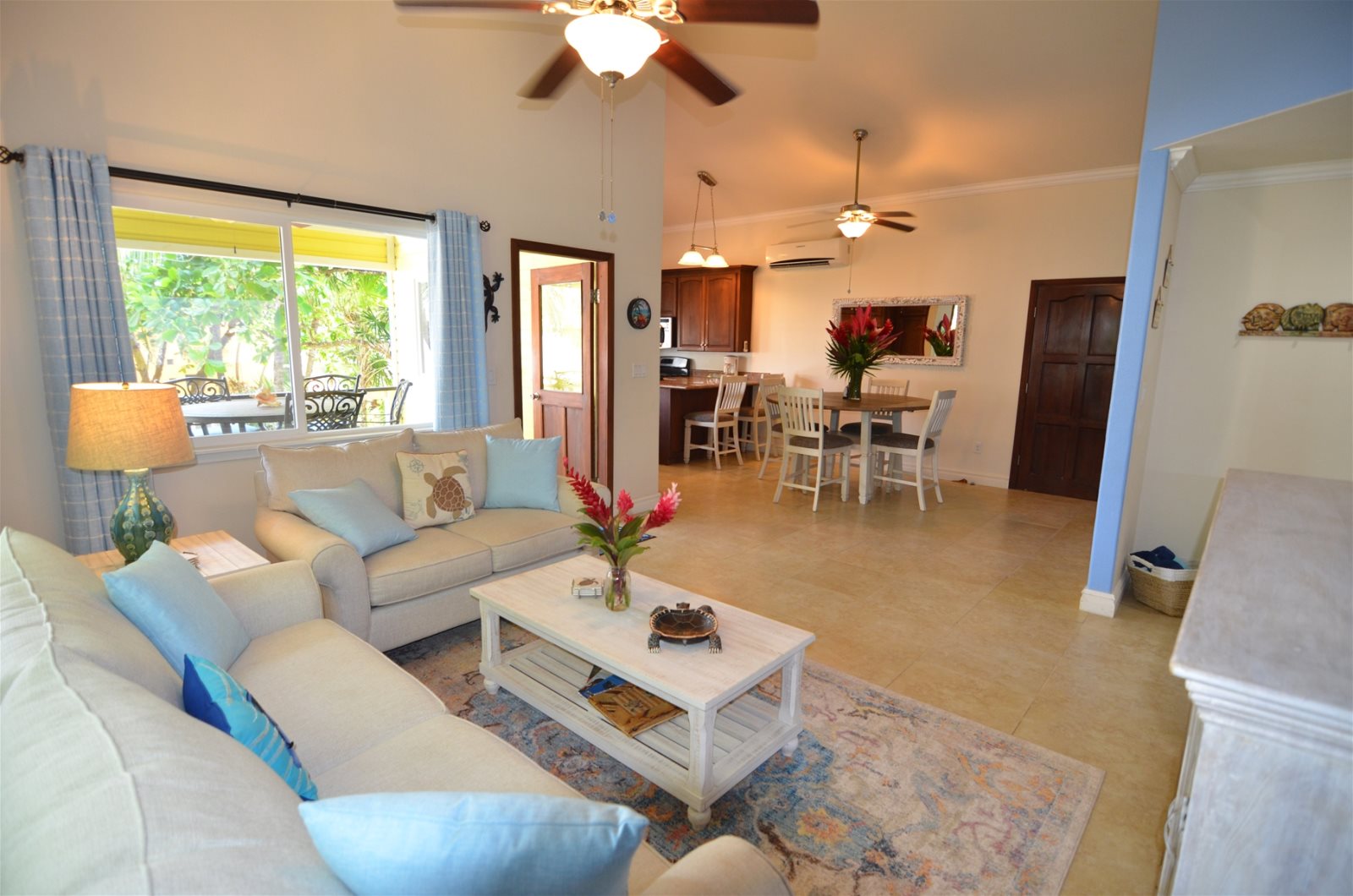 Vaulted ceilings create a very open atmosphere for the kitchen, dining and living room areas. The fully equipped kitchen offers granite counter tops, stainless steel appliances and a dishwasher, all with a fabulous ocean view.