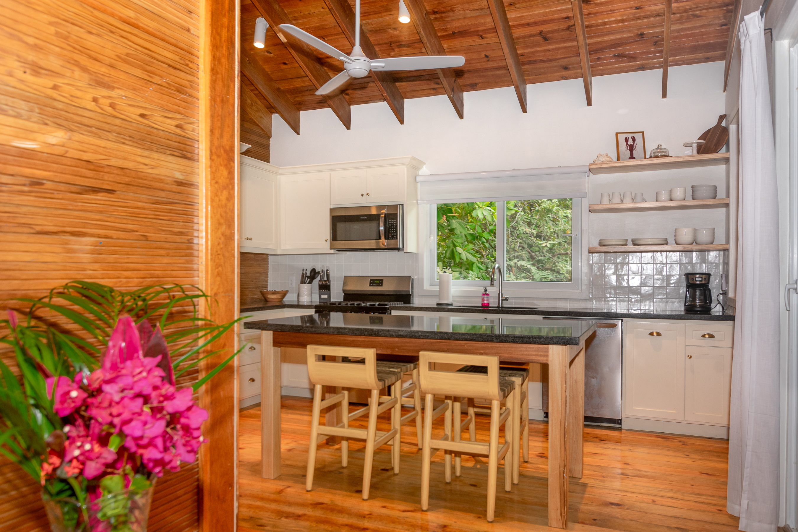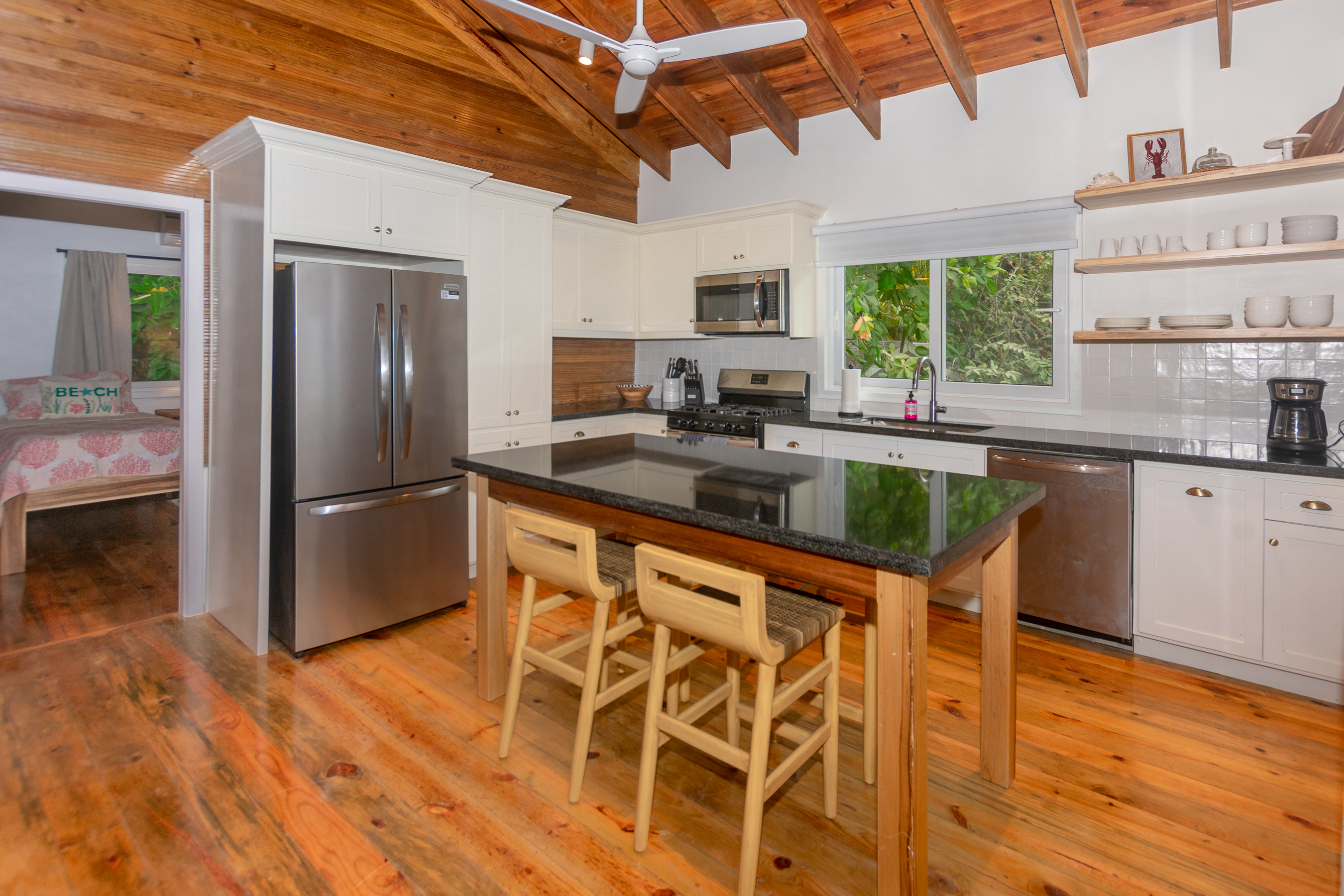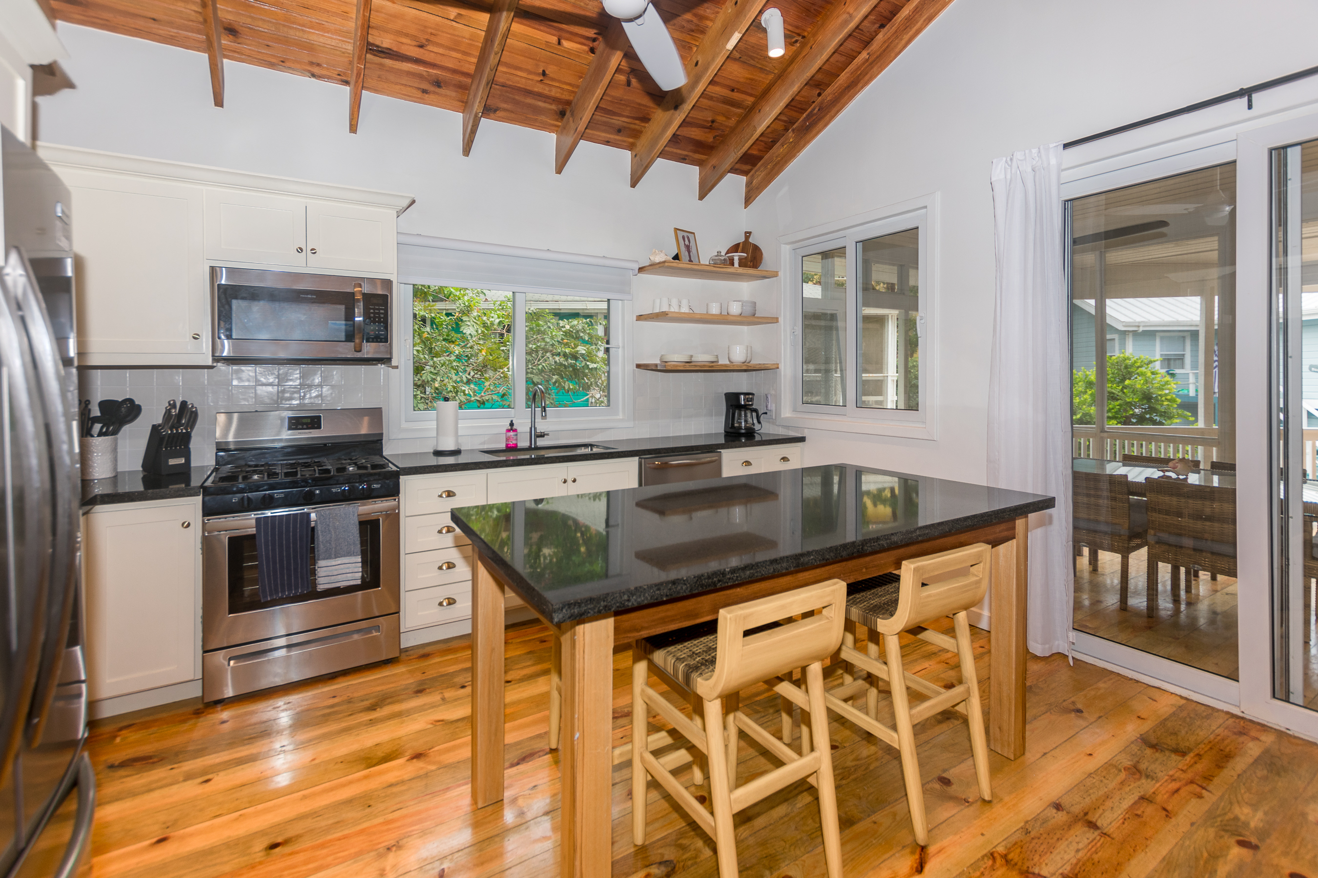 The kitchen is fully equipped with a gas range, microwave, refrigerator, and everything you need to enjoy your vacation.